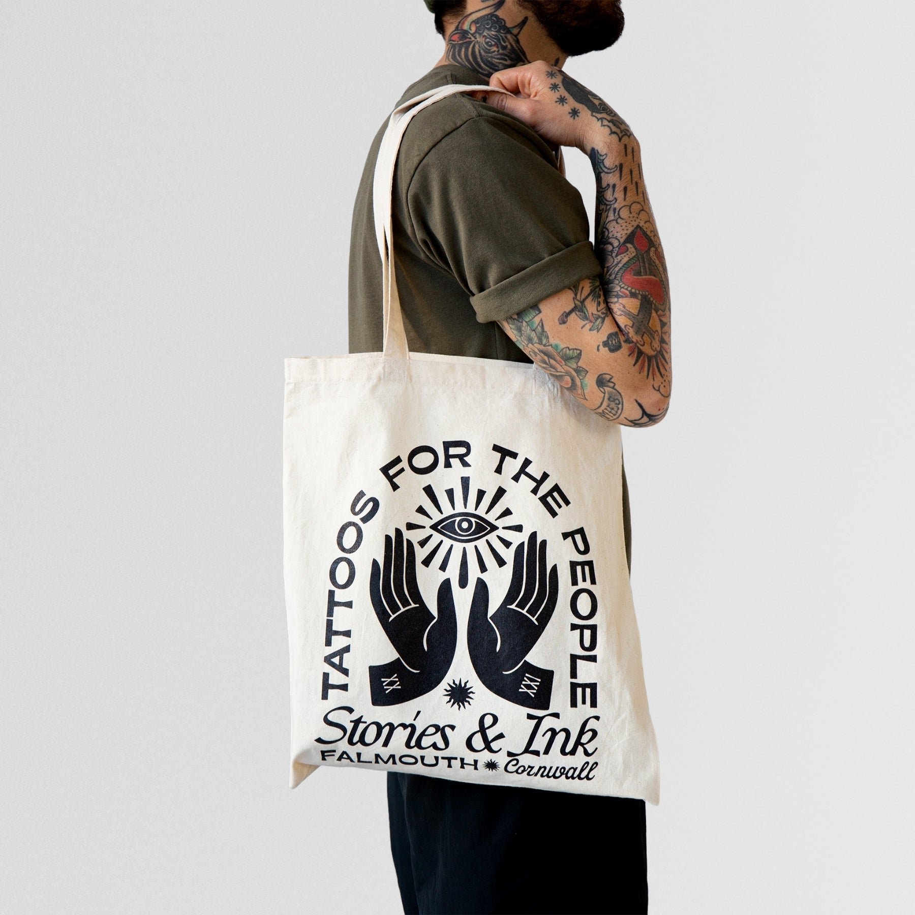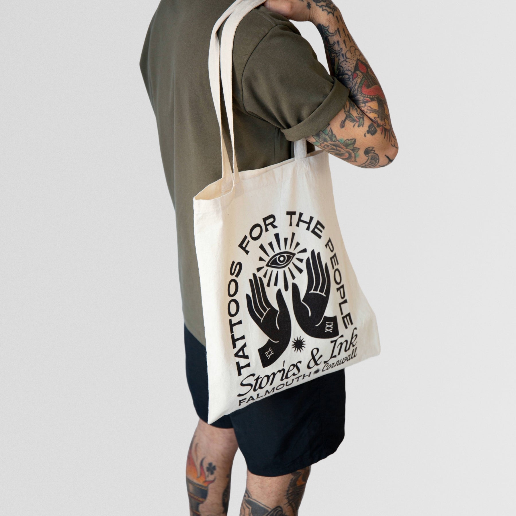 "Tattoos For The People" - a classic tote made with organic cotton, designed by artist and surfer Clara M. Jonas. This tote is a celebration of Stories & Ink opening its brand new studio space in sunny Falmouth, Cornwall.
