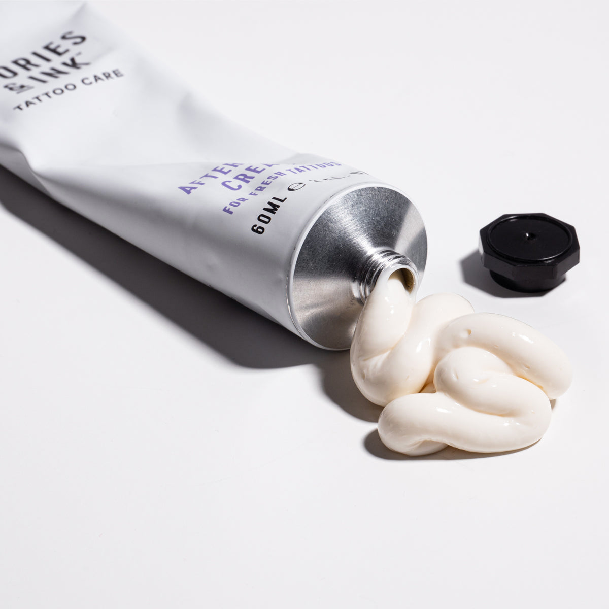 A white tube labeled "AFTERCARE CREAM FOR FRESH TATTOOS" is being squeezed, dispensing a swirl of white cream. The text on the tube also includes “60ML e 2 FL. OZ.” in black and purple. The cream is emerging smoothly from the open tube, with the bottom of the tube visible. The context is minimal, featuring a plain, neutral background that draws focus to the action of the cream being squeezed out.